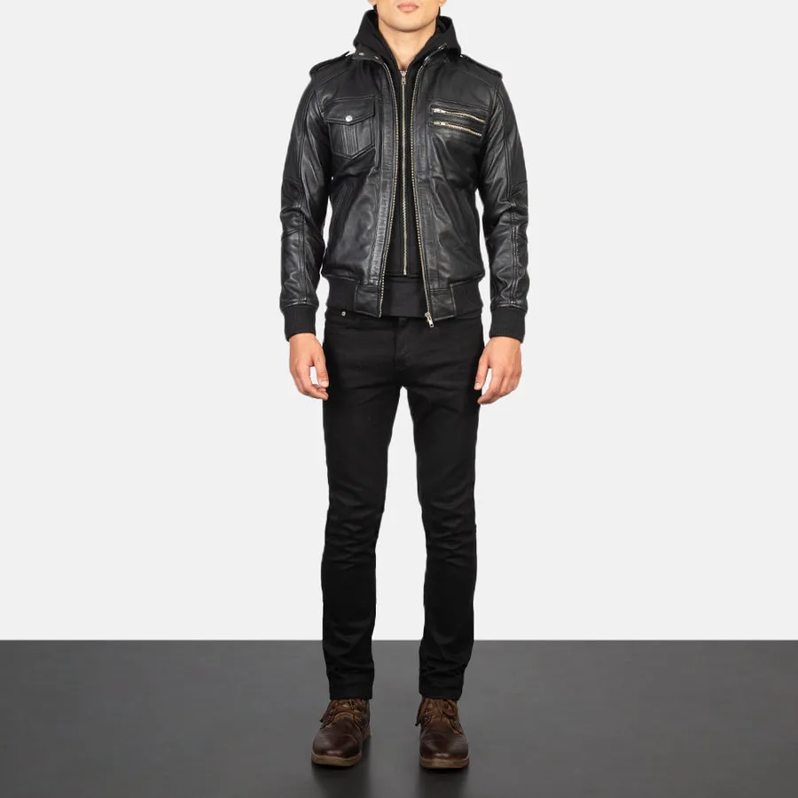 Bravado Black Leather Hooded Bomber Jacket