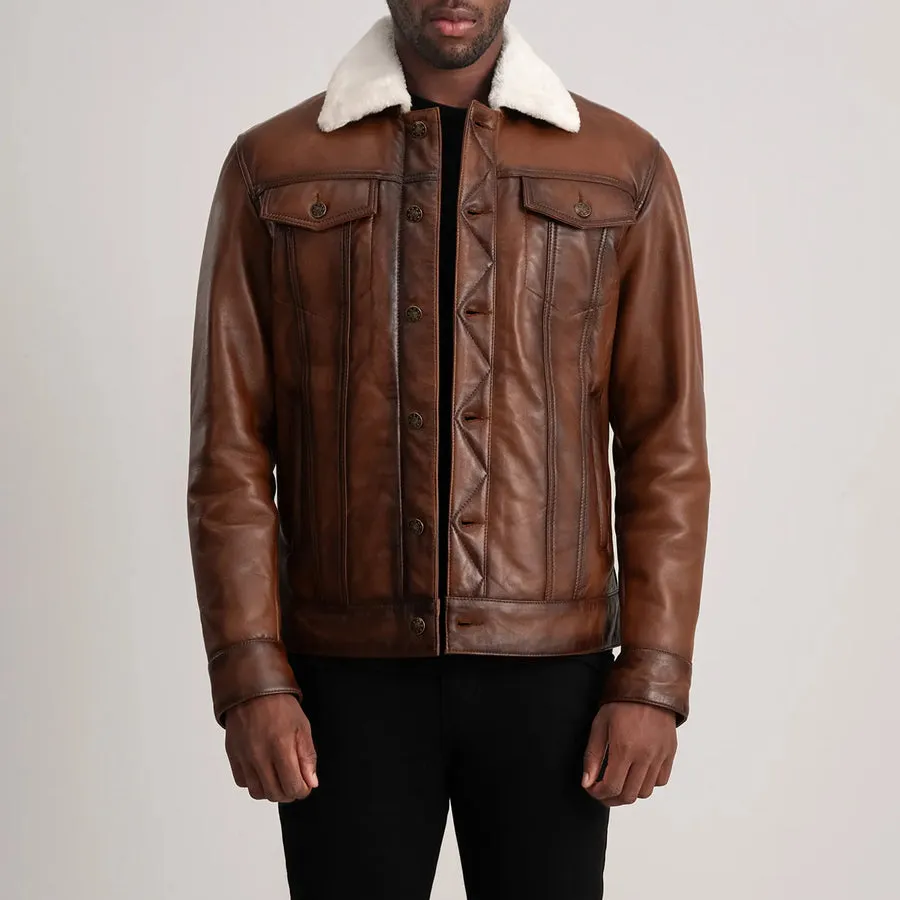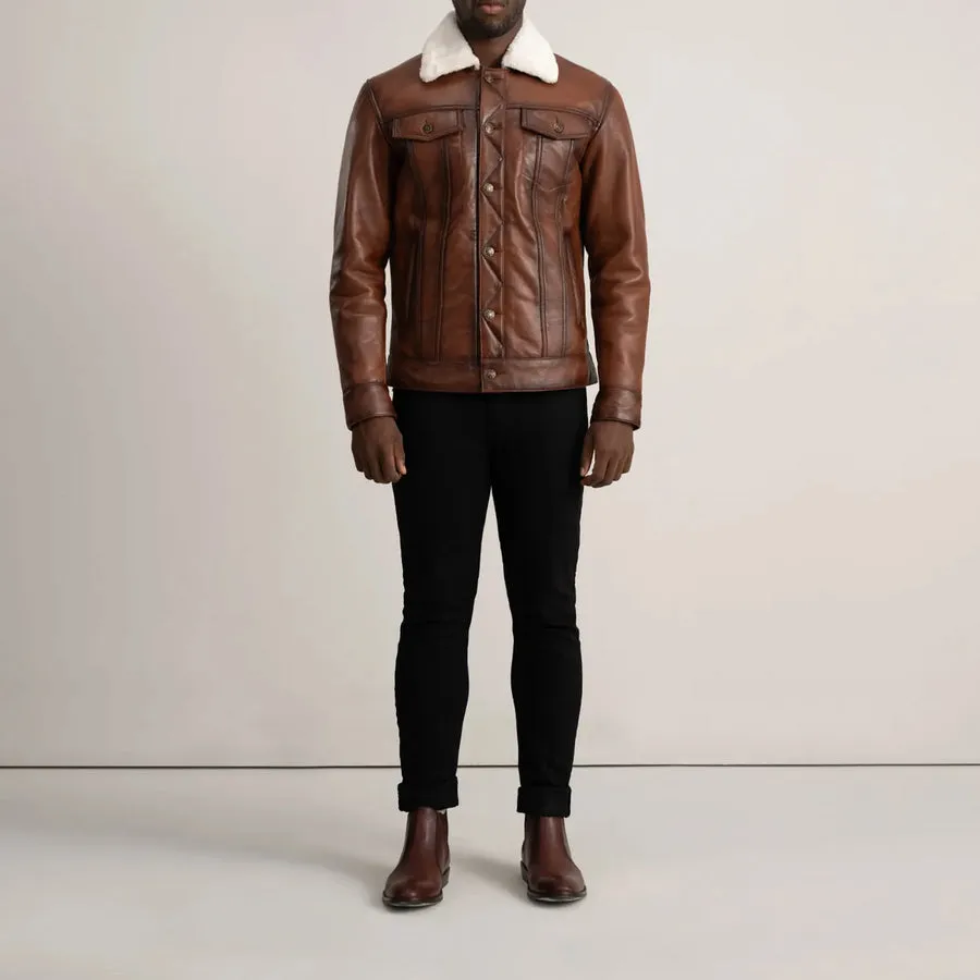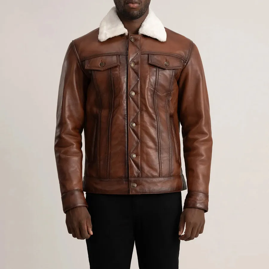 Perfect for cold weather and crafted to last for years, the Dallis Brown Shearling Trucker Jacket is a must-have addition to every gentleman’s wardrobe.