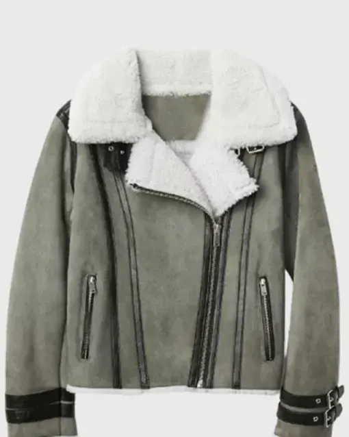 Stay cozy and stylish this winter with the Shearling Grey Leather Jacket for Women, expertly crafted from 100% real leather. This elegant jacket features a sleek grey finish, white faux shearling fur collar, and two front zipper pockets for a functional yet fashionable look.