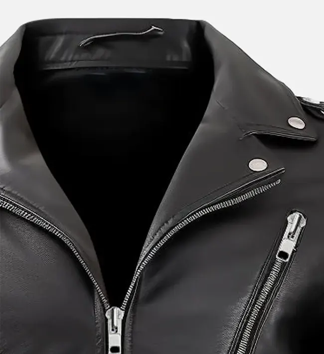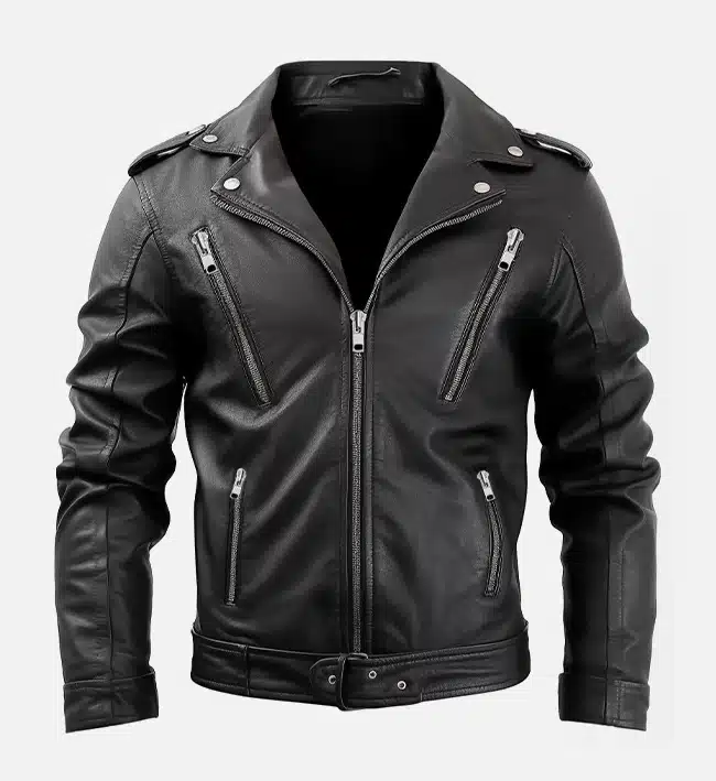 - Men’s nifty black leather biker jacket with sleek tailored fit.