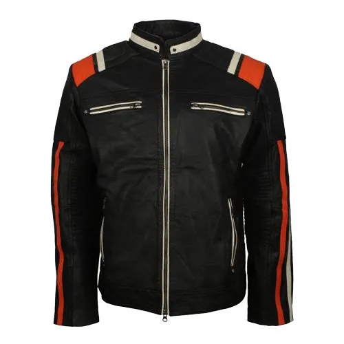 Mens Cafe Racer Striped Black Retro Biker Jacket