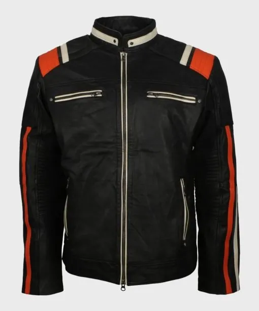 Cafe Racer Men’s Retro Black Vintage Motorcycle Leather Jacket with Stripes