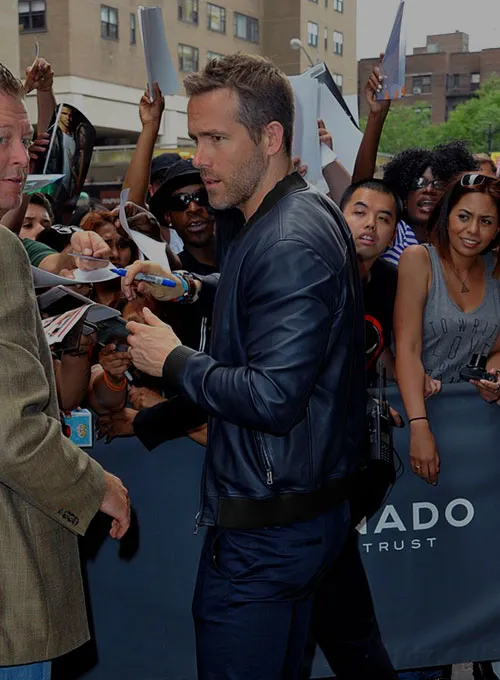Uproaringly make a statement with luxurious couture that will enhance your wardrobe with our replica leather jacket inspired by actor and producer Ryan Reynolds, which he wore while promoting his new film Selfless at AOL Studios.
