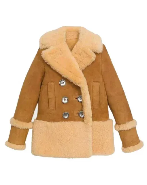 The rich brown color and timeless silhouette make it a versatile addition to any winter wardrobe, perfect for both casual and dressy occasions. Whether you’re heading to work or stepping out for a weekend stroll, this shearling peacoat is designed to keep you snug while making a statement.